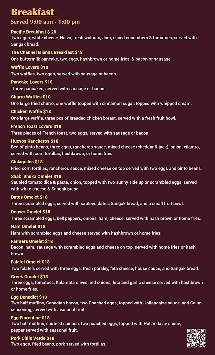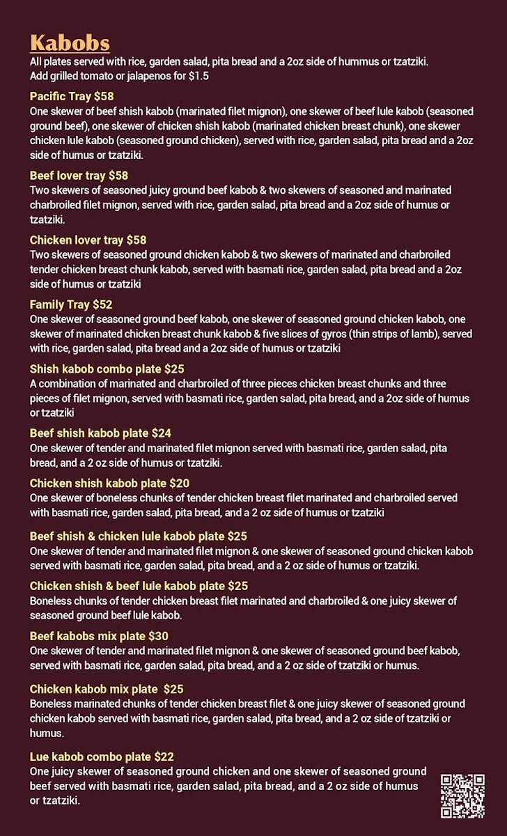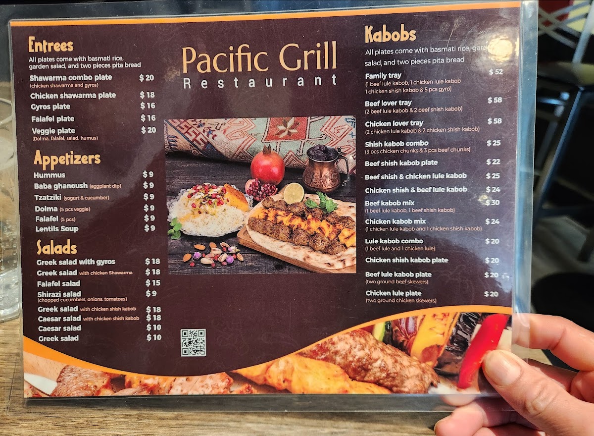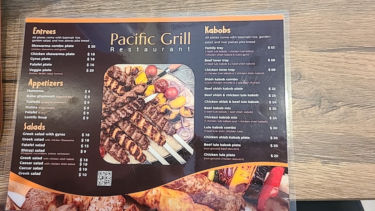 Pacific Grill’s menu leaves a well-rounded impression, blending hearty comfort foods with lighter, refreshing options that cater to a wide range of tastes. Standout savory items like the Beef Shish Kabob Plate and the flavorful Gyro Wrap showcase satisfying portions and bold, well-balanced seasoning, while breakfast and brunch favorites such as Chilaquiles and a classic Waffle add a comforting, homestyle touch. For those seeking lighter fare, the selection of Salads and vibrant Fresh Fruit options provide a refreshing contrast without sacrificing quality or taste. To round out the experience, the sweet, flaky Baklava delivers a delightful finish that lingers pleasantly. Altogether, the menu reflects a thoughtful mix of variety and consistency, making Pacific Grill a reliable spot whether you’re in the mood for something indulgent or something fresh and simple.